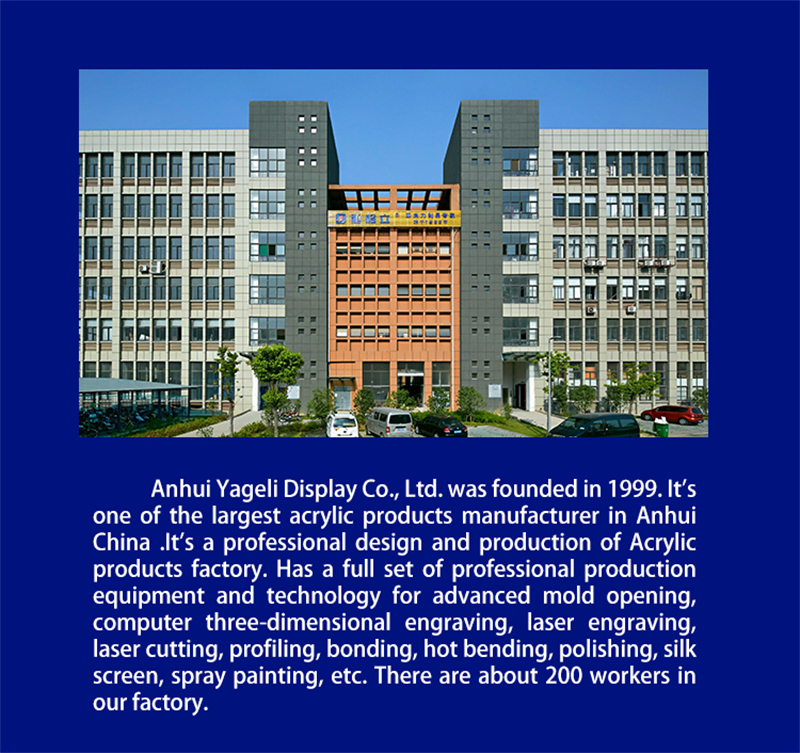 Anhui Yageli (eski adıyla Hefei Yageli Yasama Meclisi El Sanatları Fabrikası), pleksiglas ürünler, akrilik ürünler ve akrilik levhalar konusunda profesyonel tasarım ve üretim yapan bir fabrikadır ve akrilik teşhir ürünleri üretiminde 20 yılı aşkın deneyime sahiptir.