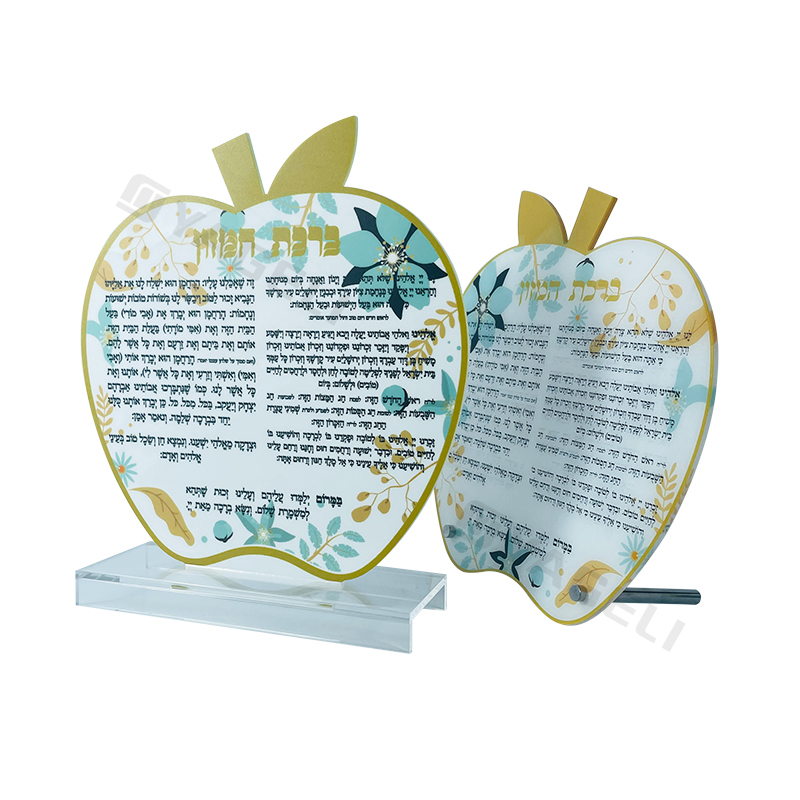 Bu Yahudi elma şeklindeki tabela, uzun ömürlü kullanım sağlayan ve kristal berraklığında görünümünü koruyan dayanıklı, çizilmeye karşı dirençli akrilik yapısıyla öne çıkıyor. Hafif ancak sağlam tasarımı, yerleştirmeyi ve taşımayı kolaylaştırırken, zamansız elma şekli ve cilalı yüzeyi çeşitli dekor stilleriyle kusursuz bir şekilde uyum sağlıyor. Kırılgan seramik veya ahşap tabelaların aksine, temizlenmesi kolay ve aşınmaya karşı dayanıklıdır ve kişisel veya törensel anlam katmak için özel gravürleri (İbranice dualar, isimler veya tarihler gibi) destekler.