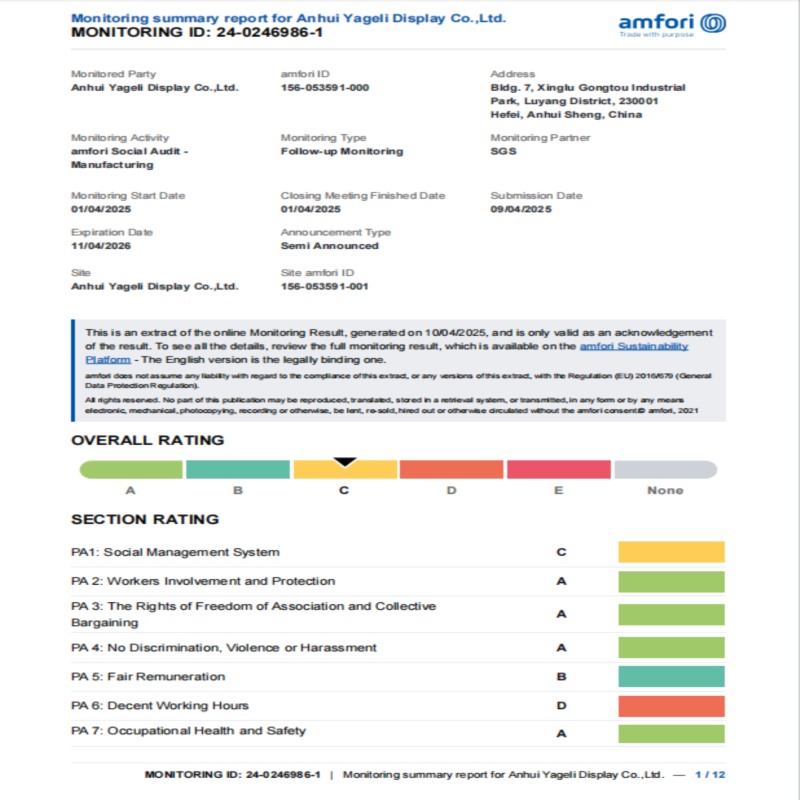 ANHUI YAGELI DISPLAY CO., LTD Achieves BSCI Certification, Committed to Providing High-Quality Card Protection Solutions